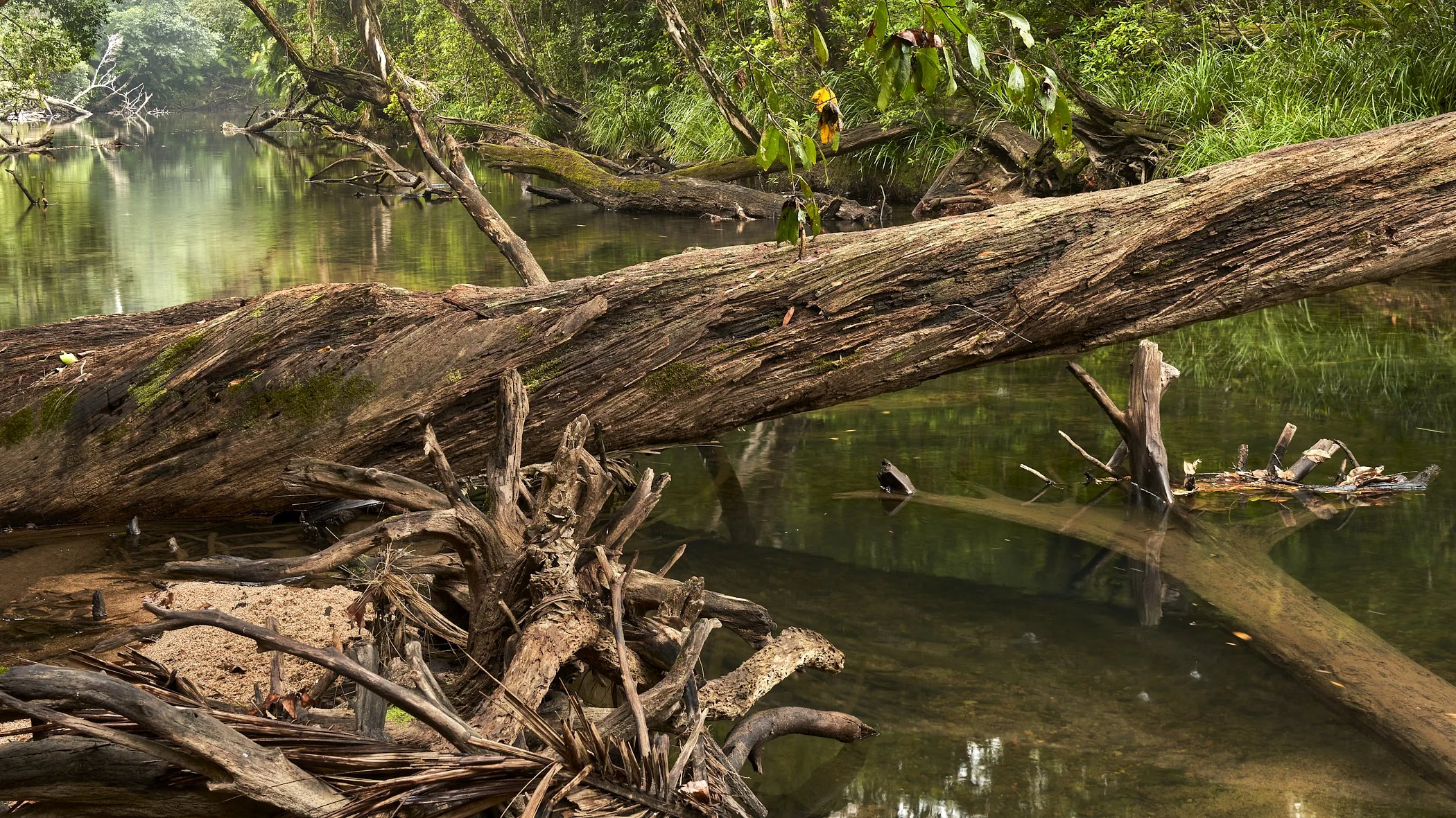 Along that rainforest walk there are several spots where you can make your way down to the water. When I first arrived at this spot there were two feral pigs in that sand in the bottom left. A striking feature of this location is the amount of deadfall in the water.
